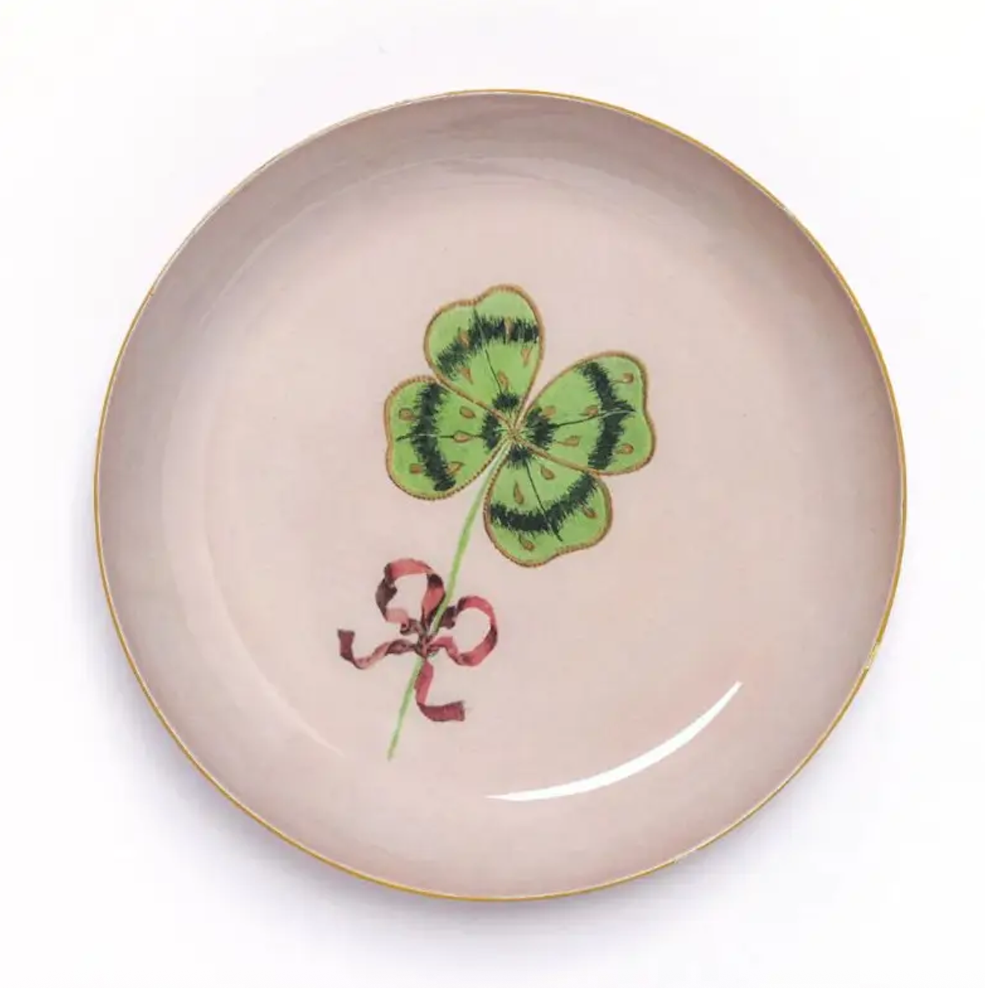 Handmade by skilled artisans in India, this decorative Clover Enamel Tray adds a delicate touch of vintage charm to any surface. The design features a Victorian-era clover motif paired with a classic vintage bow, symbolising good luck and timeless style. Set against a soft pink background with a gold-coloured base, it’s both elegant and eye-catching. Perfect for holding jewellery, stationery, or small keepsakes.